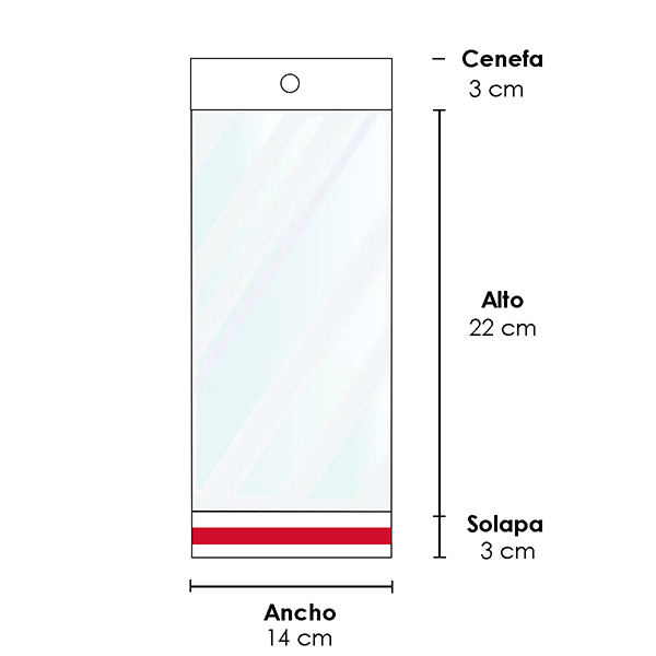Bolsa plana de celofán con pestaña adhesiva de 3 cm.