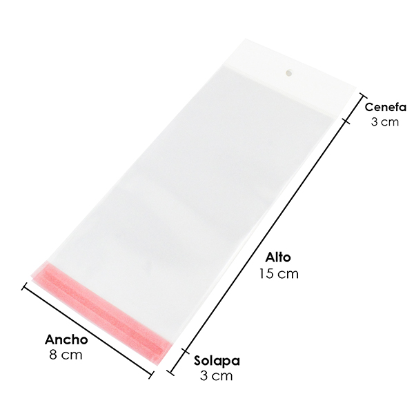 Bolsa plana de celofán con pestaña adhesiva de 3 cm y cenefa de 2.5 cm.