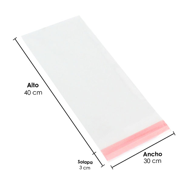 Bolsa plana de celofán con pestaña adhesiva de 3 cm.